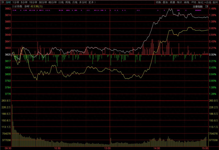 其实就在市场命悬一线的时候,如果下午市场再没有增量资金,那么指数就真的会出现下挫,与之而来的是抛盘的增加,所以13点30分之后,大家会发现突然之间一股强大的资金快速的将指数拽了起来,沪指在短短的35分钟上涨了50点,涨幅达到了1.49%,盘中指数最高到了3881点,创业板指数则上涨了3.58%。